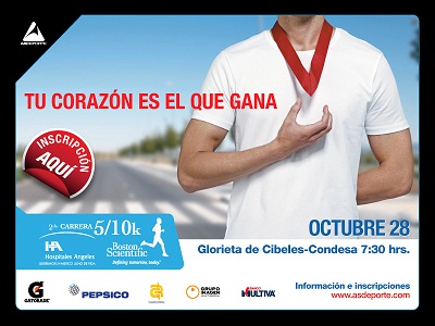 Hospitales Ángeles y Boston Scientific te invitan a participar en la 2da Edición de su carrera de 5 y 10K; en esta ocasión la salida y la meta será en la Glorieta de la Cibeles, la cita es este domingo 28 de Octubre.