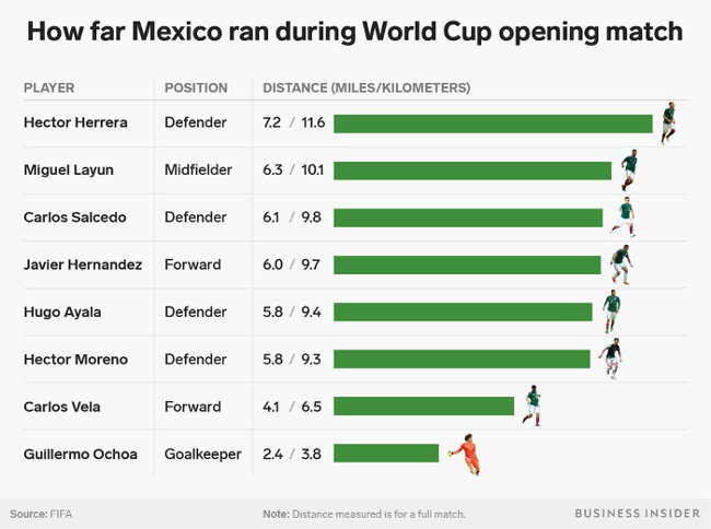Para México, el resultado se ganó con mucho esfuerzo, particularmente en el aspecto de la resistencia. El defensa Héctor Herrera corrió 11.6 km (7.2 millas), mientras el medio Miguel Layun corrió 10.1 km (6.3 millas). Hasta el portero Guillermo Ochoa corrió casi 4 km. En la siguiente tabla podemos ver cuánto corrieron en total los jugadores del “Tri” y la diferencia de acuerdo a sus posiciones.