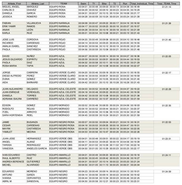 De relevo en relevo fue un continuo cambio en el liderato, hasta que el equipo ROSA tomó la delantera en el tercer relevo y ya no cedió la punta en ningún momento llegando completamente solos a la meta con tiempo de 1:21:14 h., dejando a la escuadra NARANJA con la plata (1:21:39 h) y el bronce para el cuarteto ROJO (1:21:40 h).