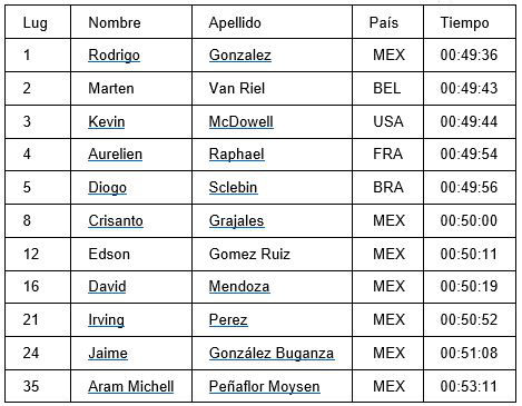 Los 5 primeros lugares y los tiempos de los mexicanos en el evento se muestran en la siguiente tabla:
